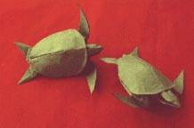 One of my favorite natural history subjects is the turtle, and the sea turtle is the most elegant of them all. Imagine this huge, yet graceful creature with few predators, free to roam the reefs in every sea. The New England Aquarium features a large, ocean tank at its heart. Although it is home to hundreds of fish, visitors enjoy watching the sea turtles as much, or more than any of the creatures. I had the opportunity to dive in the great tank many years ago, and I will never forget the smooth surfaces and flowing lines of these creatures, which enable to glide through the water. Their immense forms dominated everything else around, making it impossible to focus on detail - just shape and form. Since I had seen these creatures under a depth of water where colors are filtered out, I usually folded them from blue-green paper. Origami sea turtles were usually designed with only the top shell in mind, but I wanted to design one with a plastron, or belly plate. The simpler the shape, the more skill required to animate the character of the model. The subtle grace you add to the curves will make the model speak to the viewer. This model was developed after I had created the Koi base, so it, and my Humpback Whale are derived from that base. Perhaps it will inspire you to create other sea creatures from this versatile base. Paper choice, once again, is critical. Find paper that is stiff with sizing, pliable when moistened, yet able to hold a crease. Your sea turtle will be about half the length of the initial square.
