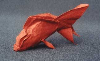This origami sculpture was created in a moment of inspired spontaneity. There were no preliminary sketches, nor rehearsals. Akira Yoshizawa had given me an orange piece of paper. To me, it seemed to say "goldfish", and so it became one in my hands! Sometimes a model just designs itself. I know that three hours passed when I folded this piece, but I was not mindful of the actual folding sequence. I realized afterwards how focused I must have been to respond to the paper as it was being folded.