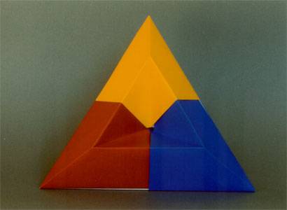 Indented Happy Good-Luck Boxes Folded from three pieces of origami paper. Kunihiko Kasahara's indentation of Molly Kahn's Triangle Box, as modified by Michael G. LaFosse. We find this variation much easier to build for beginners than its granddaddy, Molly Kahn's triangle box. "The free points ski down the white glaciers, one under each of the ledges." |