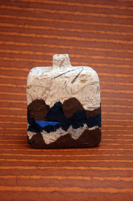 "Ceramic" Form This vase was hand-built using "paper clay," and decorated with chigiri-e, the Japanese art of torn washi picture-making. It produces a light but durable ceramic-like vase, but with the warmth of paper. Original design by Michael G. LaFosse & Richard L. Alexander |