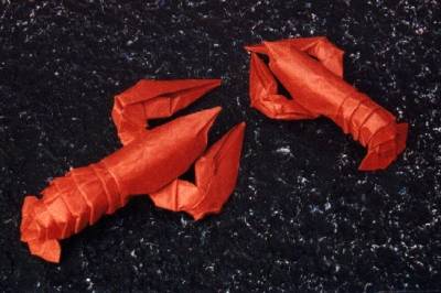 Lobsters Each is folded from a single square of "Wynstone" paper. Background paper is handmade by Michael using the spray pulp technique. Designed & folded by Michael G. LaFosse Photo by Richard L. Alexander, copyright 1994 |